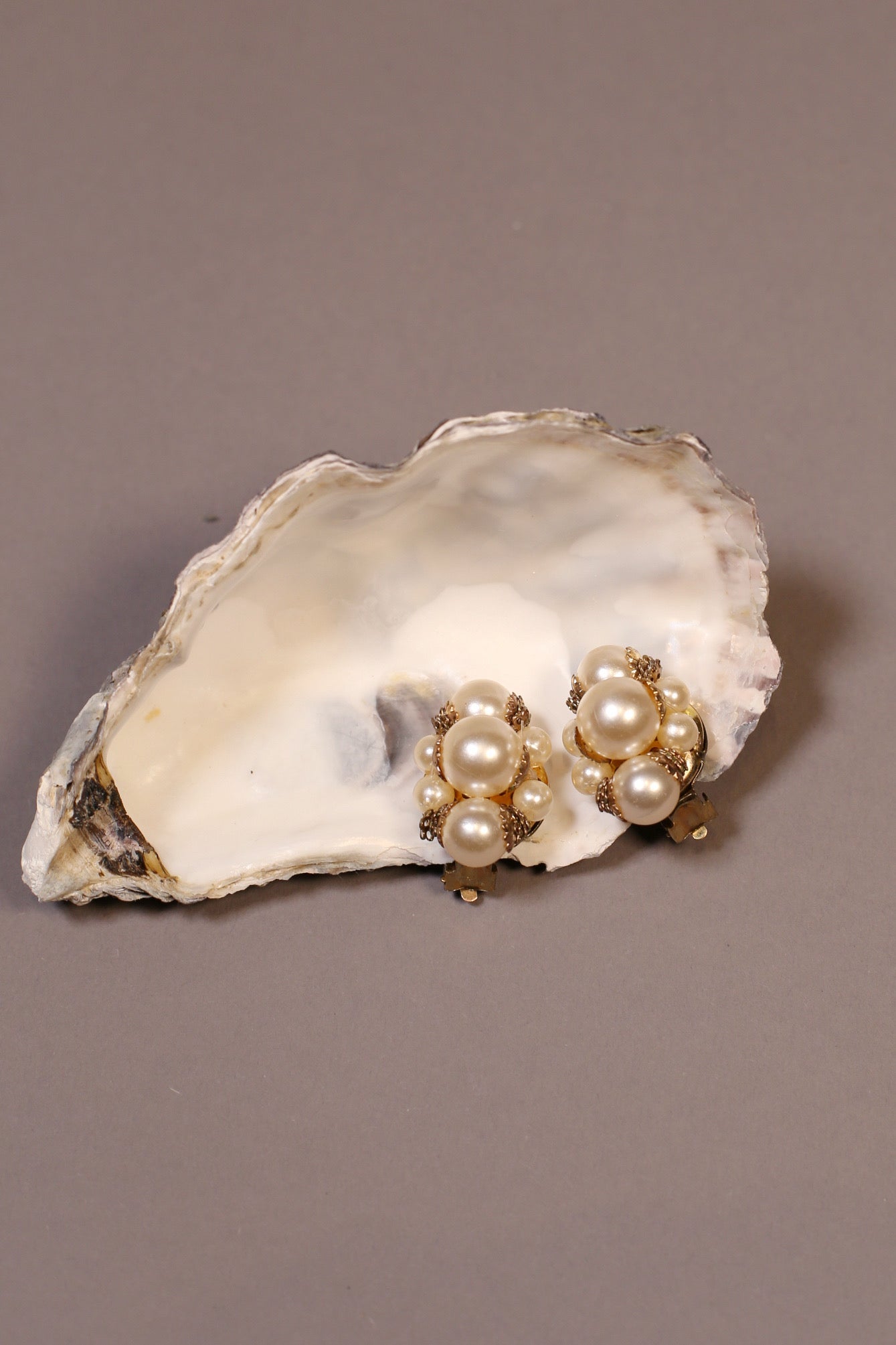 Alix de l’Aubrac is a pair of timeless vintage pearl cluster earrings in a warm gold-tone setting. Luminous faux pearls in mixed sizes create a sculptural, floral silhouette—soft, elegant, and effortlessly refined. The perfect earrings to elevate everyday knitwear and tailoring, and just as stunning for bridal moments and evening looks.