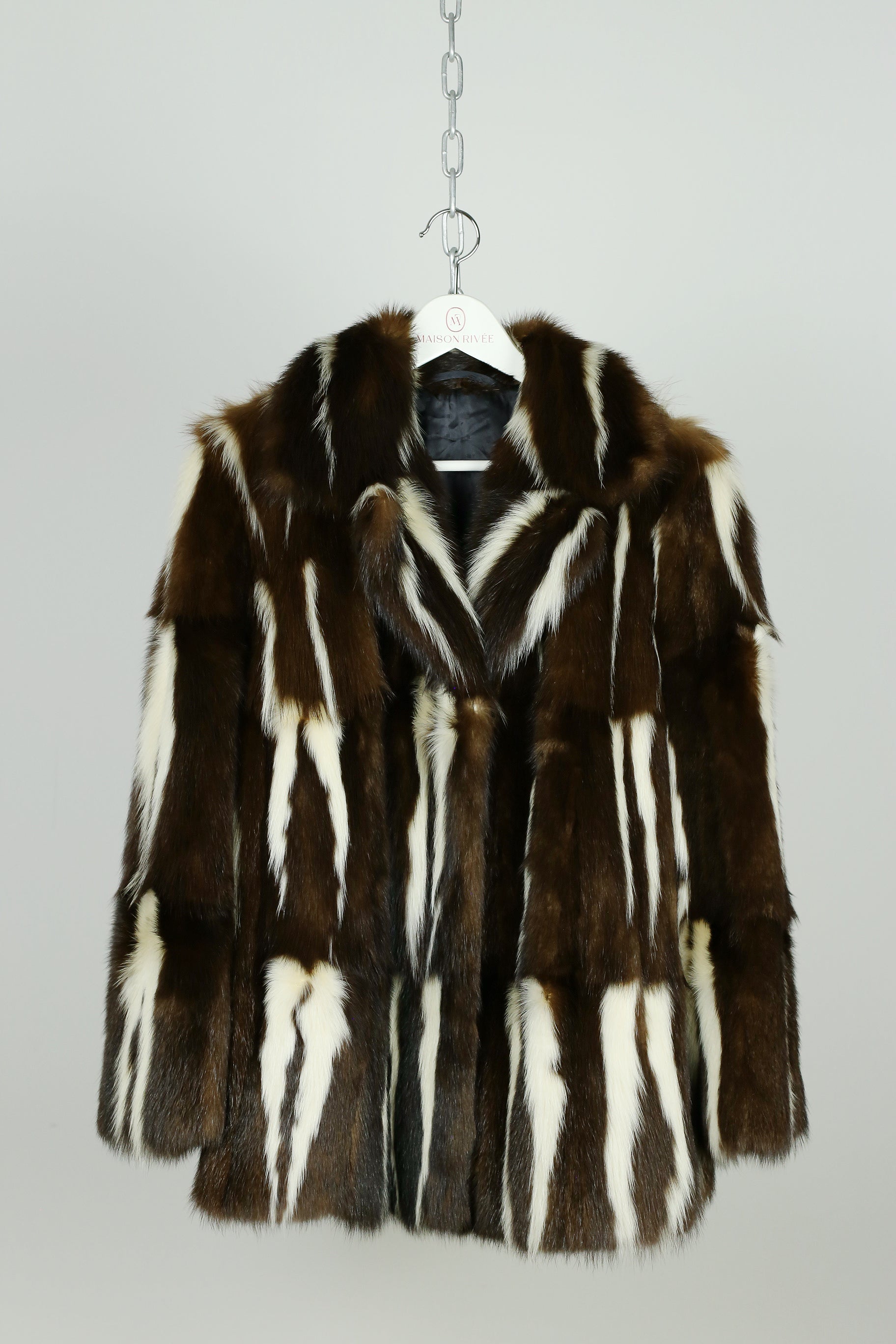 This extraordinary vintage fur long jacket captivates at first glance with its striking contrast of deep chocolate tones and crisp ivory accents. The natural striping creates an architectural silhouette — dramatic, refined, and unmistakably luxurious.